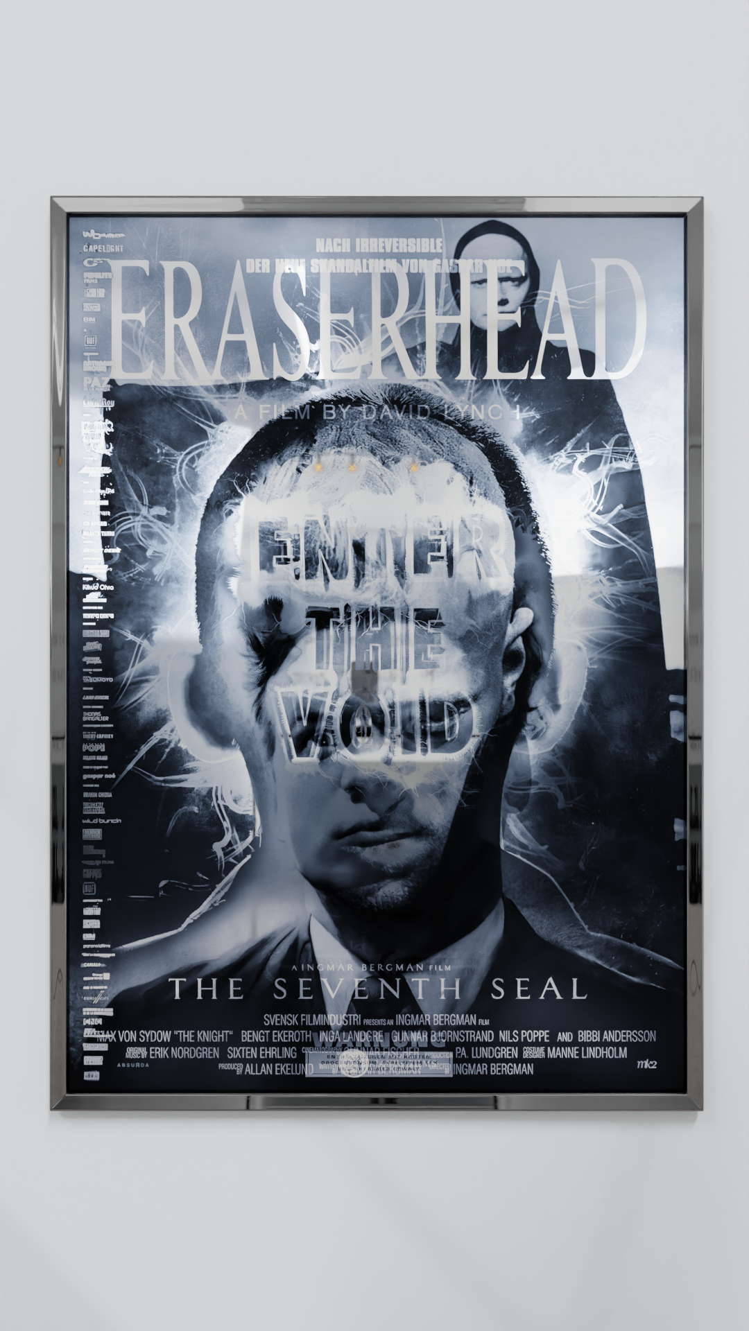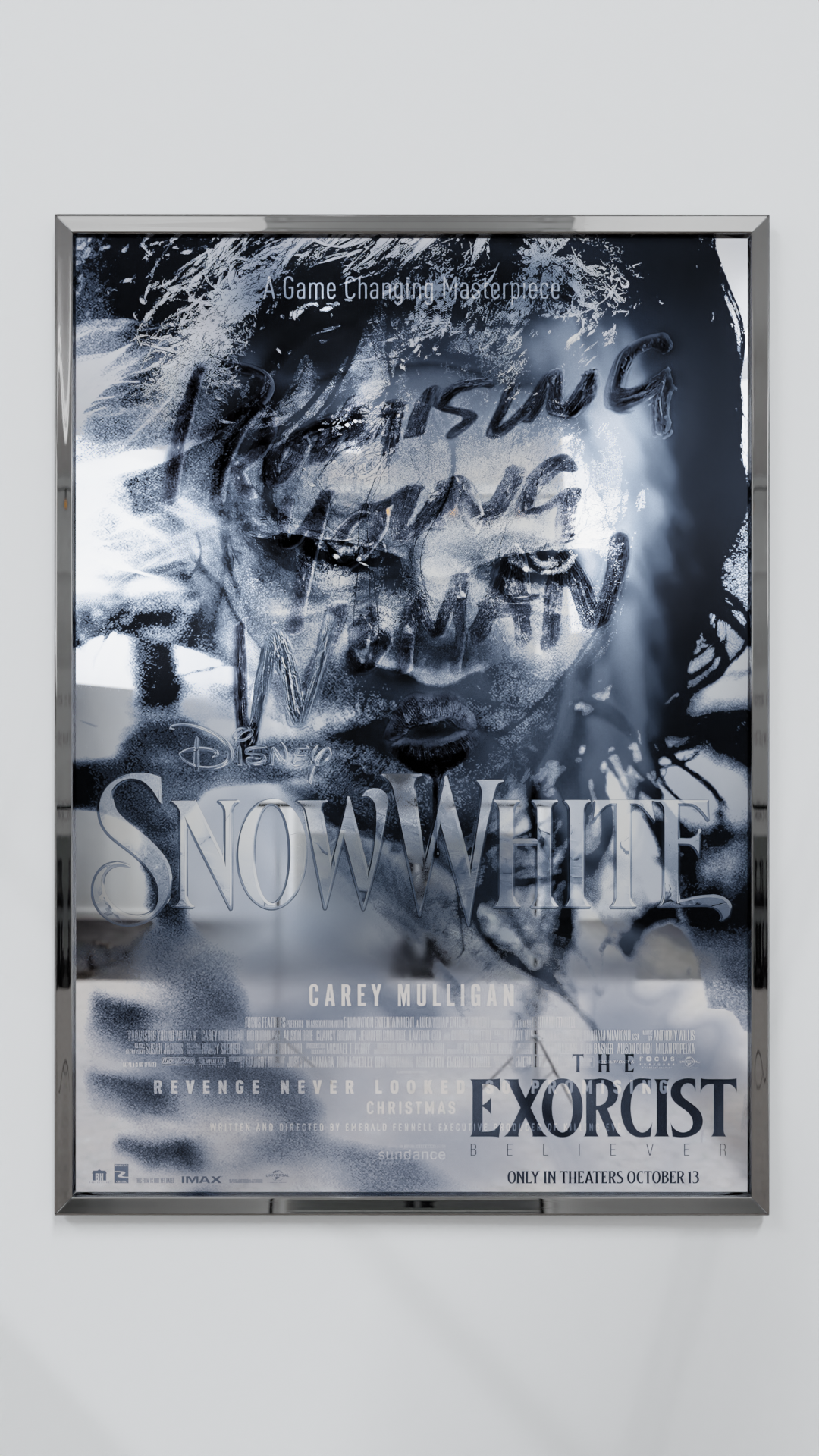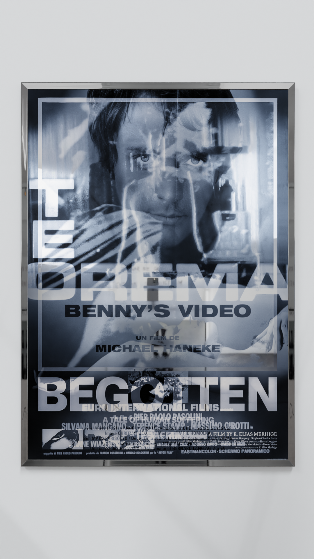 In BASTARDS (BELIEVERS), Julian-Jakob Kneer presents monochrome printed silver mirrors with custom-made galvanized frames. Each one features a layered collage of three seemingly random movie posters. Through crossbreeding ready-made opposing narratives and by sifting through themes of morality and the foundational principles of the human psychology, Kneer’s “movie posters” become contemporary zeitgeist artifacts that confront our supposed socio-cultural binaries of right and wrong, art and pop, and sickness and health. Kneer breaks them down into their constituent parts, and releases them for recasting in a value-free queer space.